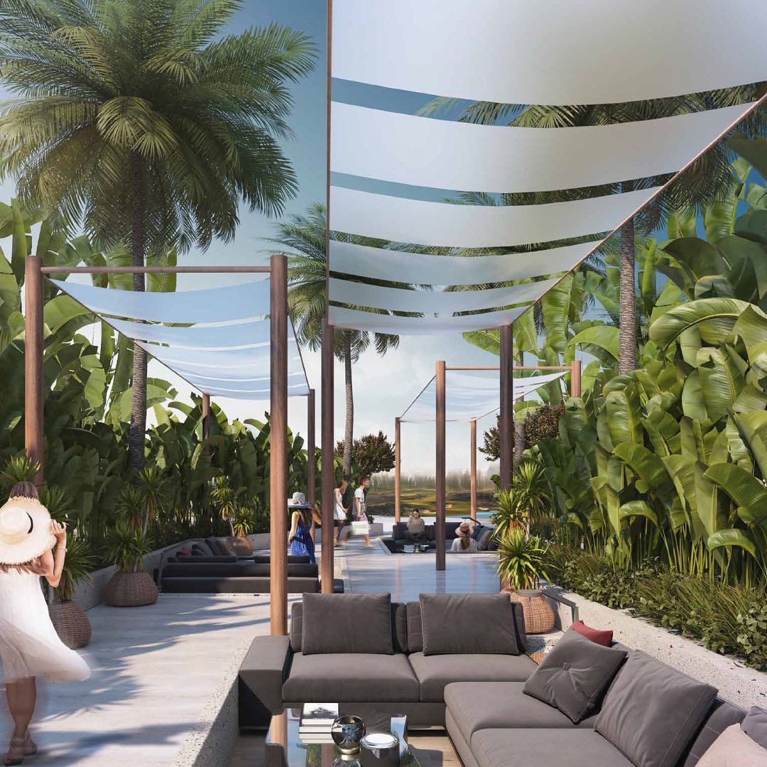 bazény, kavárny, zahrady, bezpečnostní služby, parkovací plochy, Trump International Golf Club, fitness klub a lázně, upravená terasa s hřišti, prostor na grilování, nákupní galerie s restauracemi a další